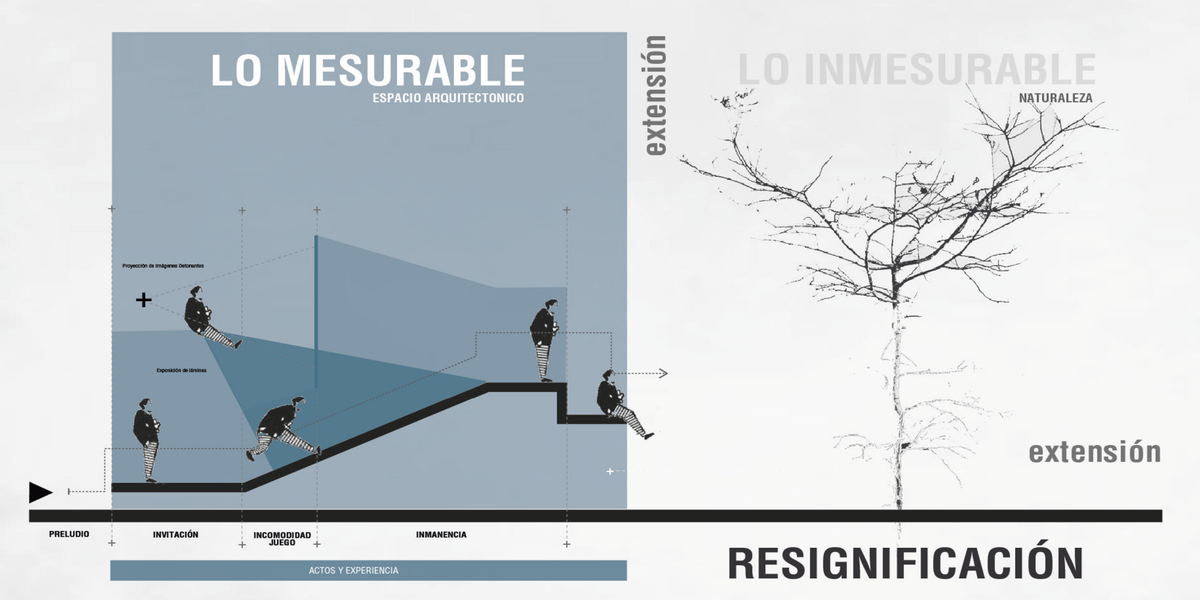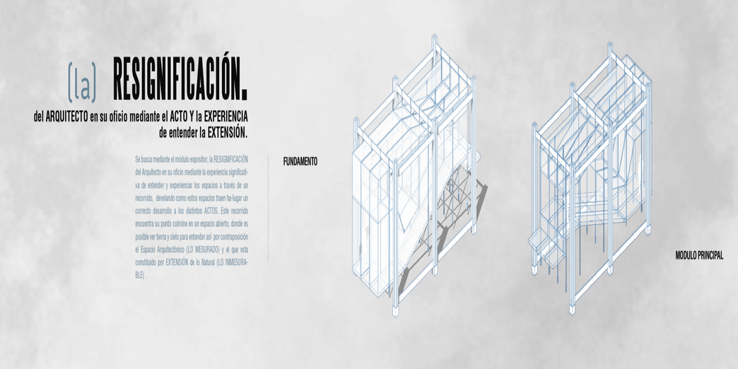 The proposal contemplates a main module with the possibility of being playable. It generates a hanging structure with a tight linear path, which in a first instance (prelude) invites you to join it by looking at its contents and then walk through it. In a second instance or “act” the space provokes instability, imbalance and discomfort through its compression, inviting to the playful tour and the experience of the game. The third act is a state of immanence through the projection of images that open questions about the architect's craft.