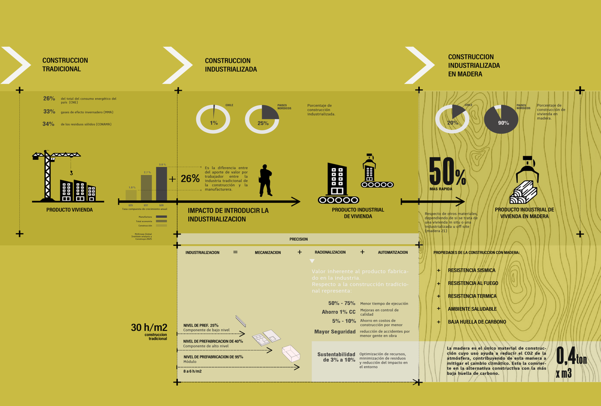 This project is carried out within the research area, with the idea of analyzing the correct implementation of the main trends and singularities of the industrialization processes of the building industry in developed countries, particularly medium-rise wood buildings. The growing process of high-rise densification that is occurring in most urban centers around the world and the negative impact this has had in environmental terms, allows the study to address the building from a constructive, technological and materiality paradigm change, encouraging the real estate industry to generate a move towards a more sustainable production. This research will guide a strategic and conceptual systematic analysis that will allow to give added value to the industrial housing product, through concrete operations applied to a construction system, with wood as the predominant material. The research concentrates on construction, focusing mainly on constructive and production aspects, discarding architectural spaces or other variables that could be associated to the studied topic.